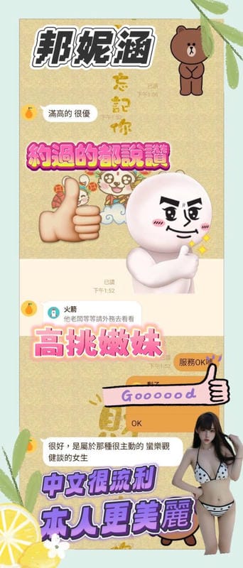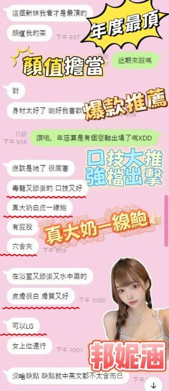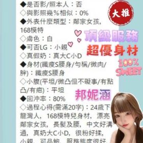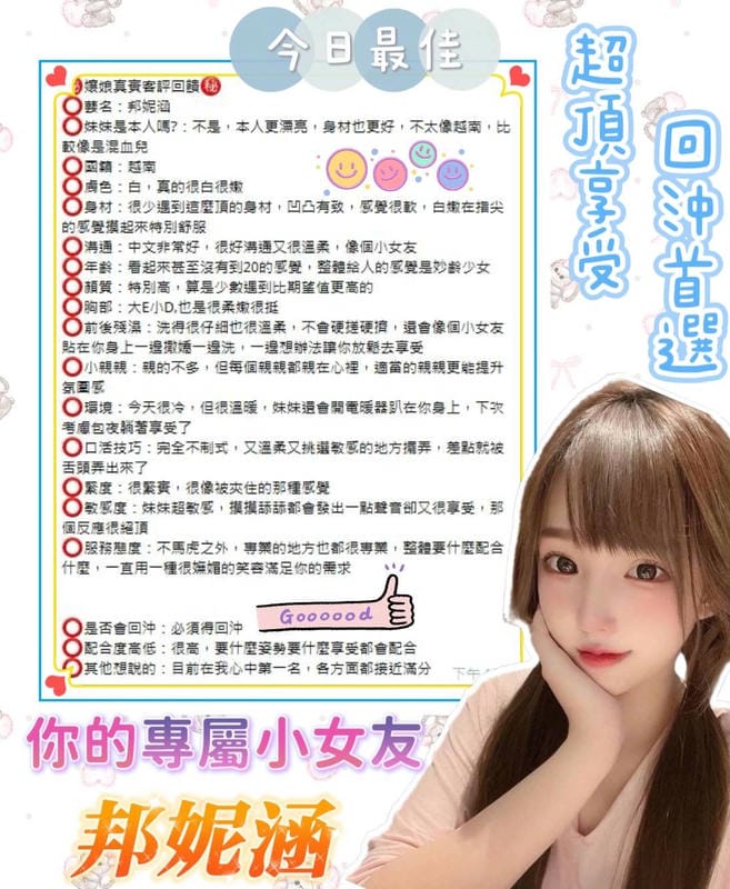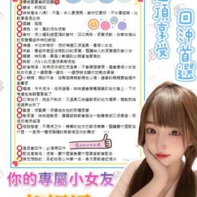 奶砲,按摩,69,陪洗,共浴,LG(舌吻)依氣氛衛生而定,可親嘴,無套吹,口爆,品鮑,舔蛋,自慰秀,快餐,2S,包夜,射後清槍