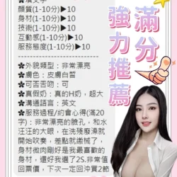 奶砲,按摩,共浴,泰國浴,LG(舌吻)依氣氛衛生而定,可親嘴,無套吹,口爆,品鮑,奶推,冰火,絲襪(自備免付),玩具(按摩棒),玩具(跳蛋),情趣用品(客自備),英文溝通,快餐,2S