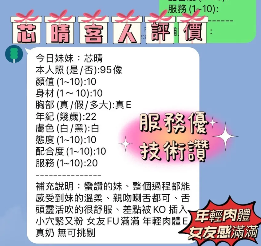 奶砲,毒龍,按摩,69,共浴,LG(舌吻)依氣氛衛生而定,可親嘴,無套吹,口爆,品鮑,舔蛋,奶推,屁推,冰火,顏射,浴中蕭,深喉嚨,變裝(自備免付),絲襪(自備免付),快餐,2S