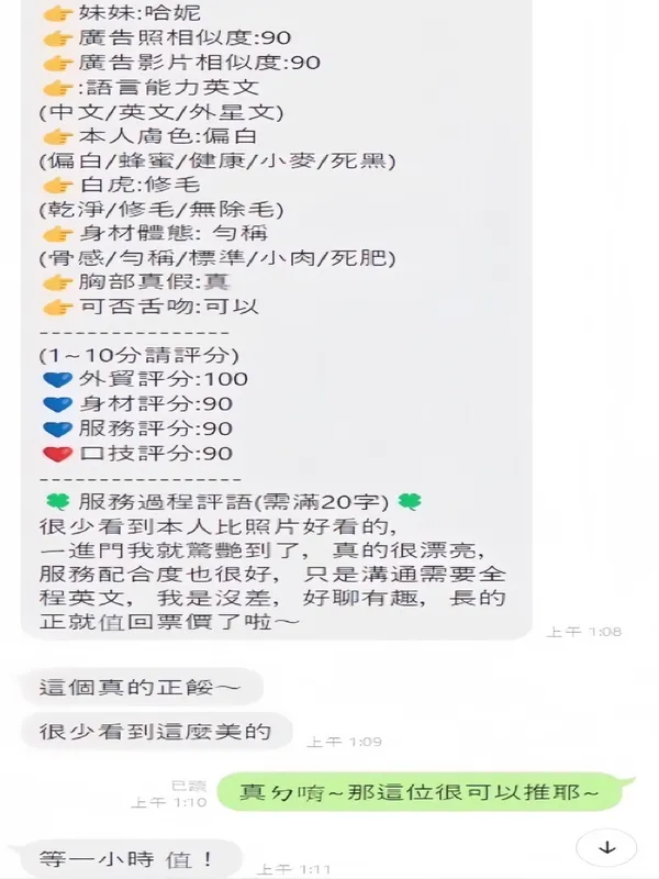 奶砲,按摩,69,共浴,LG(舌吻)依氣氛衛生而定,可親嘴,無套吹,口爆,潮吹(依貴賓技術而定),品鮑,舔蛋,奶推,屁推,變裝(自備免付),絲襪(自備免付),玩具(按摩棒),玩具(跳蛋),情趣用品(客自備),無套做,無套內射,白人,中文溝通,英文溝通,快餐,2S,NS,包夜,射後清槍
