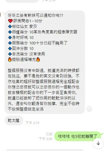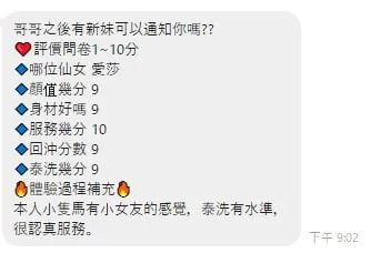 奶砲,按摩,69,共浴,LG(舌吻)依氣氛衛生而定,可親嘴,無套吹,口爆,吞精,潮吹(依貴賓技術而定),品鮑,舔蛋,奶推,屁推,冰火,顏射,水床浴,浴中蕭,深喉嚨,艷舞秀,絲襪(自備免付),玩具(按摩棒),玩具(跳蛋),情趣用品(客自備),自慰秀,白人,英文溝通,快餐,2S,包夜