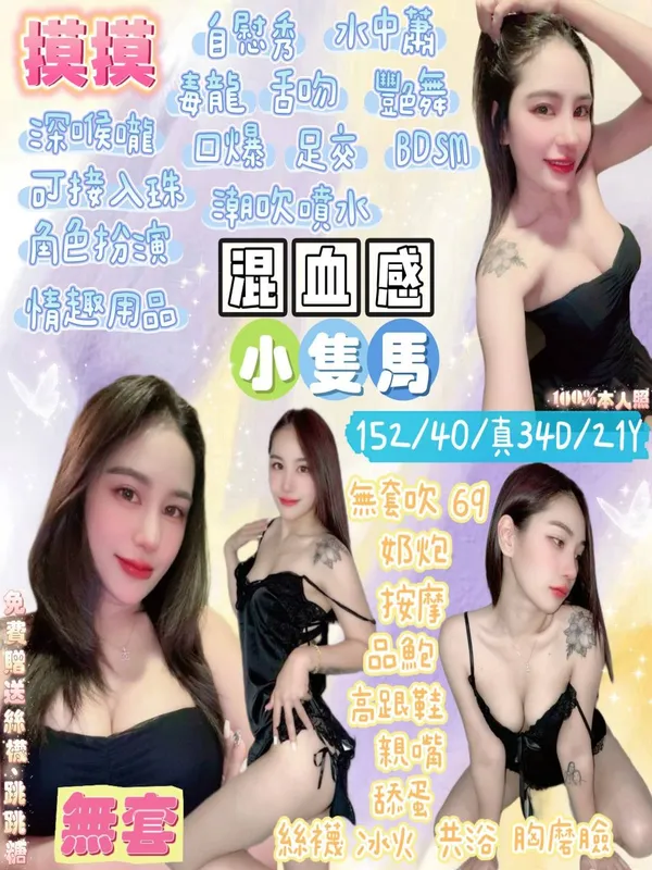 奶砲,毒龍,按摩,69,共浴,LG(舌吻)依氣氛衛生而定,可親嘴,無套吹,口爆,足交,潮吹(依貴賓技術而定),品鮑,舔蛋,冰火,浴中蕭,深喉嚨,艷舞秀,跳跳糖吹簫,變裝,絲襪,玩具(按摩棒),玩具(跳蛋),無套做,自慰秀,快餐,2S,包夜