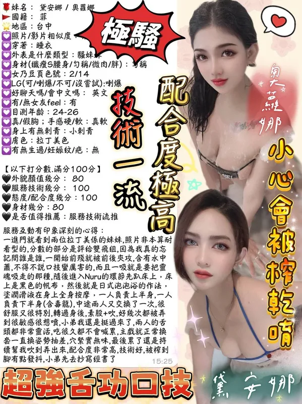 2S+500(60分鐘)/顏射+500/口爆+500/口爆吞精+1000/自衛秀+500(客自備情趣用品)/清槍+500/可與黛安娜雙飛/長鍾贈送Nuru按摩