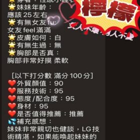 可配合 : 奶砲,按摩,共浴,泰國浴,LG(舌吻)依氣氛衛生而定,可親嘴,無套吹,口爆,品鮑,舔蛋,冰火,顏射,海底撈月,艷舞秀,變裝,絲襪,自慰秀,快餐,2S