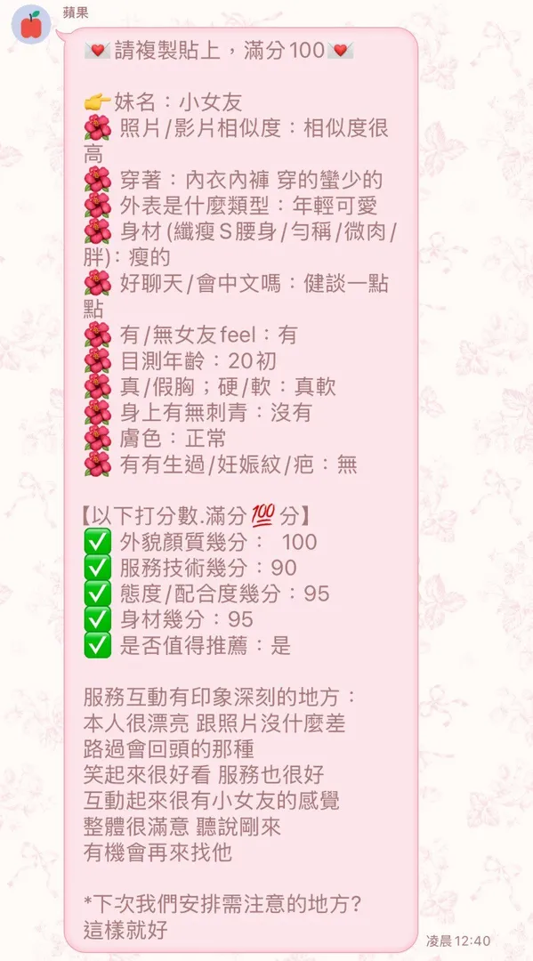 奶砲,按摩,69,共浴,LG(舌吻)依氣氛衛生而定,可親嘴,無套吹,品鮑,舔蛋,奶推,顏射,絲襪,中文溝通,英文溝通,快餐,2S