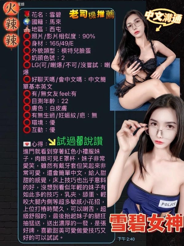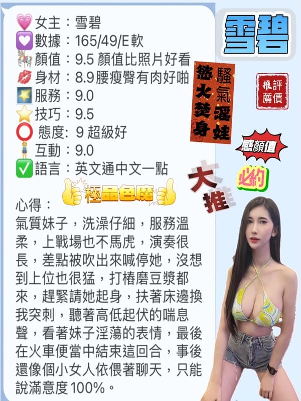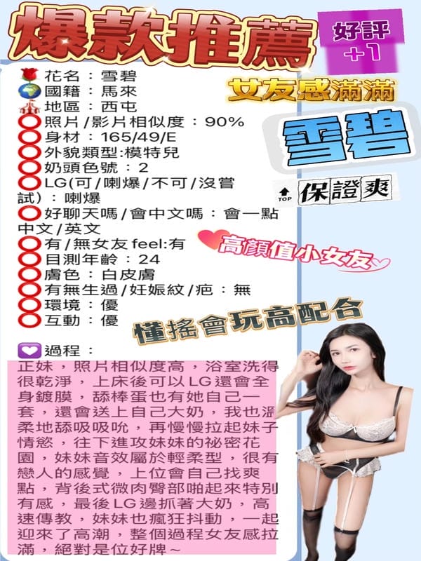 奶砲,按摩,69,共浴,LG(舌吻)依氣氛衛生而定,可親嘴,無套吹,口爆,潮吹(依貴賓技術而定),品鮑,舔蛋,奶推,屁推,顏射,浴中蕭,絲襪,無套做,無套內射,後門,自慰秀,中文溝通,快餐,2S