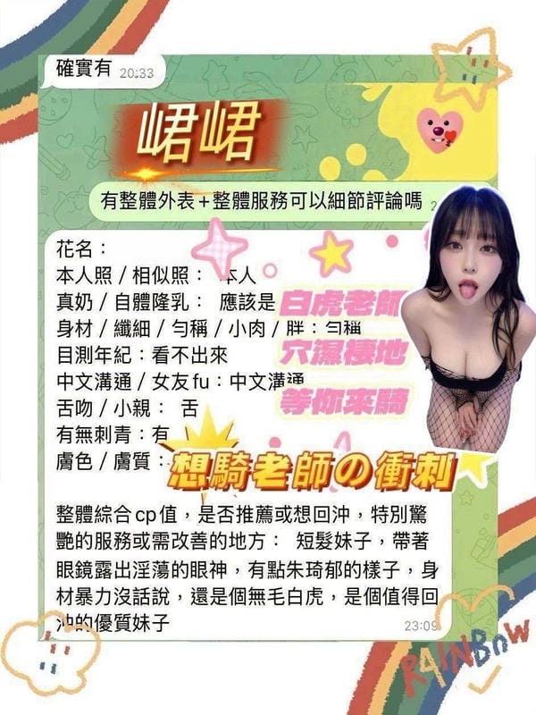 奶砲,按摩,69,陪洗,共浴,LG(舌吻)依氣氛衛生而定,可親嘴,無套吹,口爆,品鮑,舔蛋,顏射,自慰秀,快餐,2S