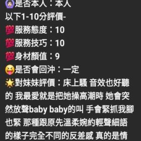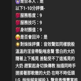 奶砲,按摩,69,共浴,殘廢澡,泰國浴,LG(舌吻)依氣氛衛生而定,可親嘴,無套吹,口爆,品鮑,舔蛋,奶推,屁推,顏射,絲襪(自備免付),玩具(按摩棒),玩具(跳蛋),情趣用品(客自備),無套做,無套內射,自慰秀,快餐,2S,NS