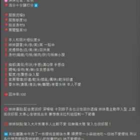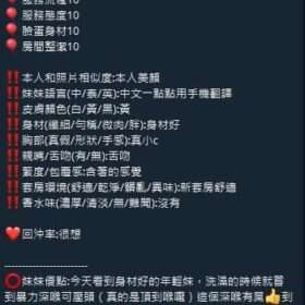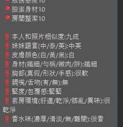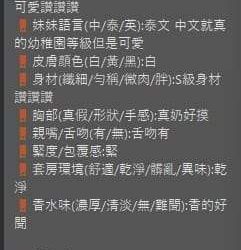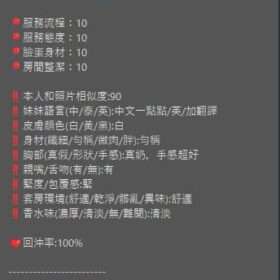 69,共浴,LG(舌吻)依氣氛衛生而定,可親嘴,無套吹,品鮑,舔蛋,冰火,浴中蕭,變裝(自備免付),絲襪(自備免付),中文溝通,英文溝通,快餐,NS