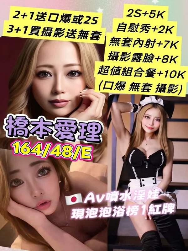 2S+5000、口爆+2000、角色扮演(服裝需自備)+2000、自慰秀+2000、無套內射+7000、露臉攝影+8000、2+1送口爆或2S(二擇一)、3+1買攝影送無套內射、超值組合餐+10000(口爆 無套 攝影)、車資依地區計價