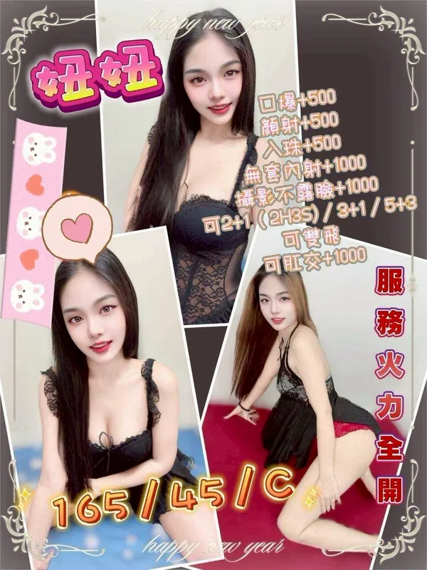 2S+500(60分)、口爆+500、顏射+500、入珠+500、後門+1000、無套內射+1000、攝影+1000(不露臉)