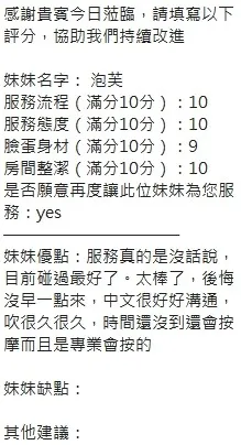 奶砲,毒龍,按摩,69,共浴,LG(舌吻)依氣氛衛生而定,可親嘴,無套吹,口爆,品鮑,舔蛋,奶推,屁推,顏射,水床浴,變裝(自備免付),絲襪(自備免付),後門,中文溝通,快餐,2S