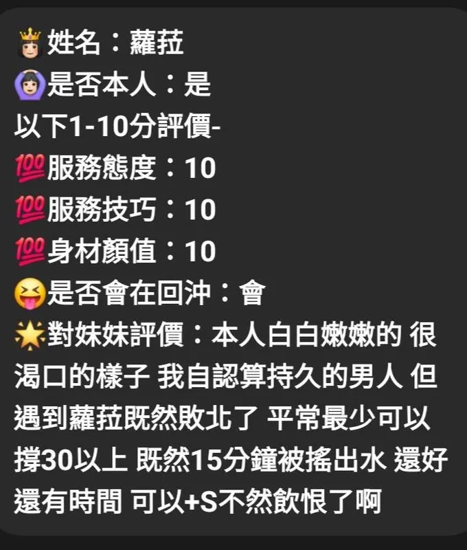 奶砲,毒龍,69,共浴,殘廢澡,泰國浴,LG(舌吻)依氣氛衛生而定,可親嘴,無套吹,口爆,品鮑,舔蛋,奶推,屁推,絲襪(自備免付),無套做,無套內射,自慰秀,攝影,快餐,2S,NS