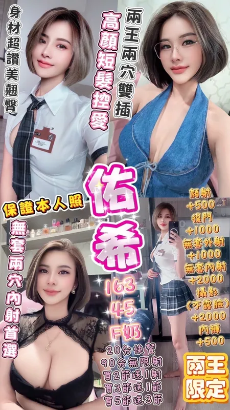 2S+500(60分) , 後門+1000 , 無套外射+1000 , 無套內射+2000 , 顏射+500 , 原味內褲+500 , 裸舌毒龍+300(妹妹幫洗屁股) , 自慰秀+500 , 攝影(不露臉)+2000
