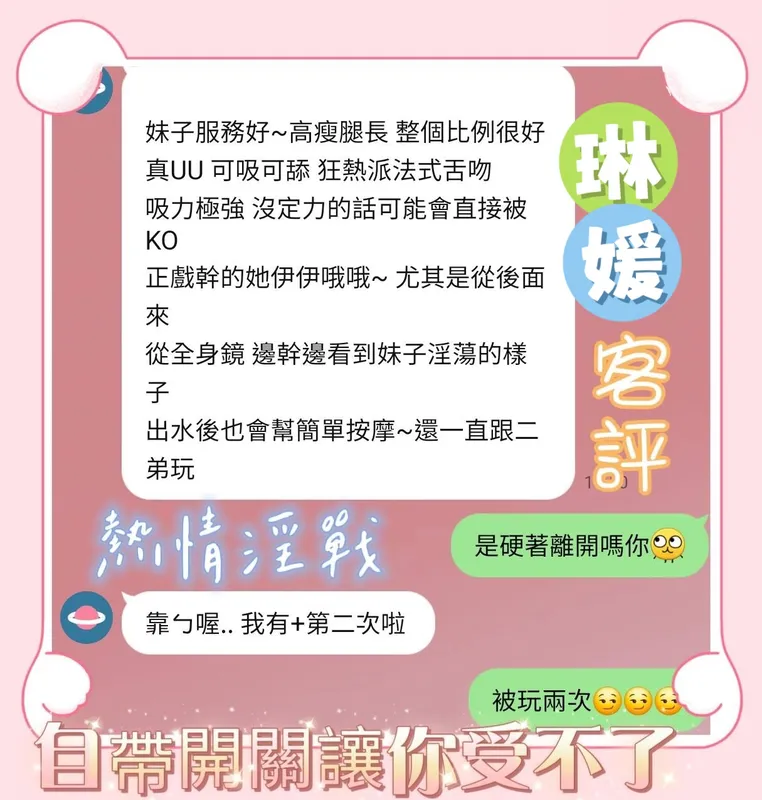 2S+500(60分鐘)、顏射+500、口爆+500、攝影+1000(不露臉)、無套內射+1000